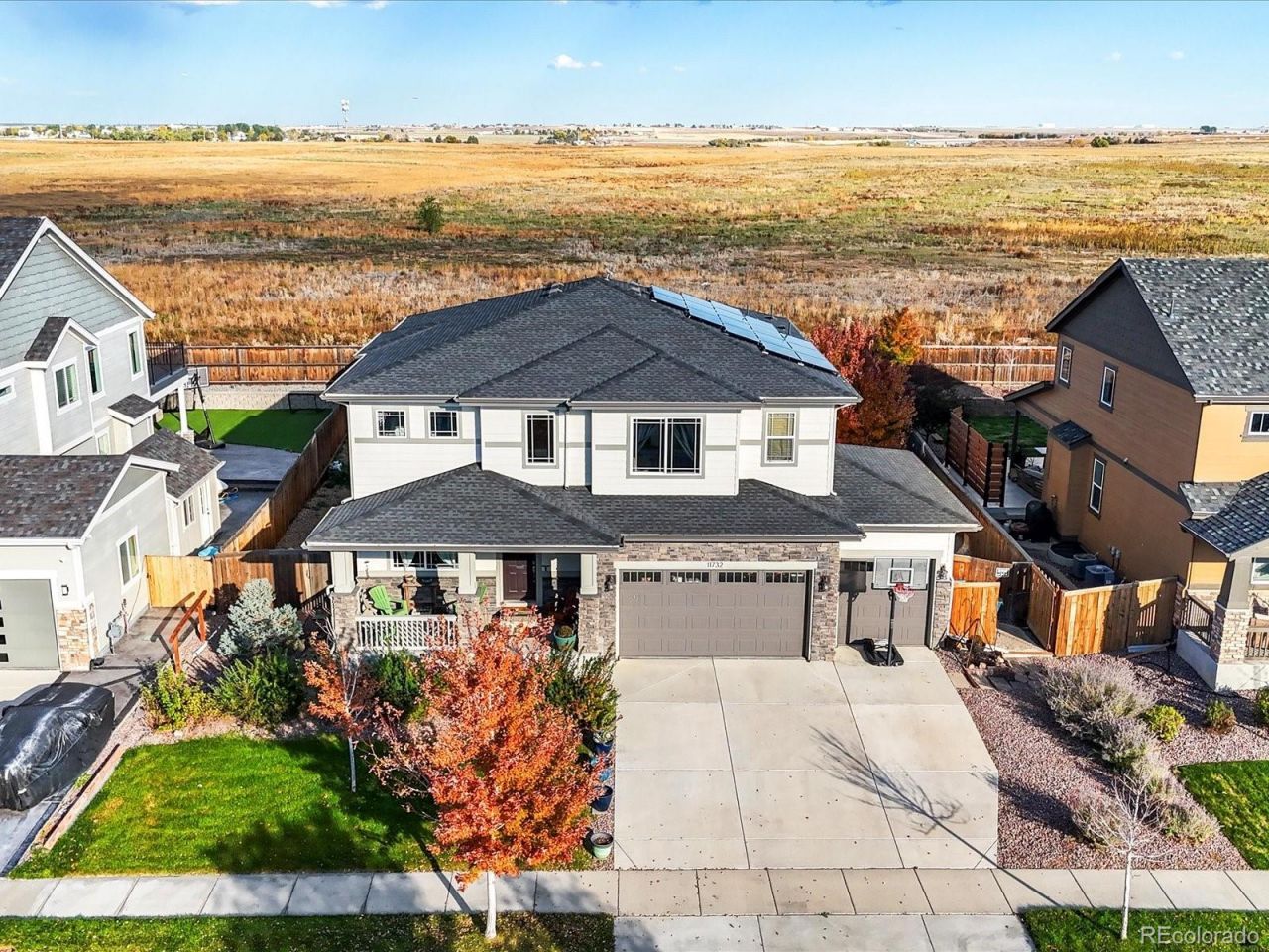 Back on the market due to the buyers not securing their loan 2 days before closing. Through inspection + appraisal smoothly. Welcome to The Hills at Buffalo Run, where space, upgrades, and location come together in a BIG way. This home sits on one of the largest lots in the community and offers a layout that truly works for everyday living and entertaining. The main level features a bright, open floor plan with effortless flow between the living areas. The kitchen is a standout with 42 white cabinets with crown molding, slab granite countertops, double ovens, Frigidaire Gallery appliances, a 5-burner gas cooktop, and a large center island made for gatherings. A casual dining nook plus a full formal dining room give you flexible space for any occasion. The great room is filled with natural light and anchored by a sleek gas fireplace. A main-level office or den, powder bath, and excellent storage, including a walk-in coat closet for add convenience and function. Upstairs, the primary suite offers a large sitting area, five-piece bath, and a massive walk-in closet. Two additional bedrooms, each with walk-in closets, share a dual-sink bath. A versatile loft and sought after upstairs laundry complete the level. Big-ticket upgrades include paid-off solar panels, dual A/C and furnace systems (one per level), and built-in surround sound in the family room. The unfinished basement features 9 ceilings and rough-in plumbing, ready for future expansion. Outside, enjoy a covered front porch, manicured landscaping, and a private backyard backing to an open space for peace and privacy. With a 3-car garage, quick access to E-470, and Buffalo Run Golf Course just steps away, this home delivers space, value, and location, dont miss it!