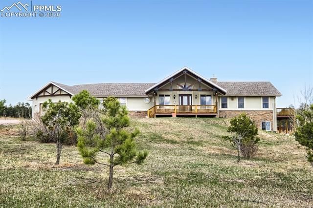 This stunning stucco and stone rancher in desirable D20 sits on 3.5 acres and truly has it all. Enjoy convenient main-level living with three bedrooms, a dedicated office (easily used as a fourth bedroom or nursery), and a versatile bonus room. This unique, oversized space between the garage and main home is perfect for a sunroom, plant studio, or home-based business. The open floor plan is ideal for everyday living and entertaining, featuring a spacious great room, a dining area that accommodates a large table, and a well-designed kitchen with ample space for multiple cooks. Take in the breathtaking mountain views from three decks and a large covered patio—perfect for relaxing or hosting guests. Cozy up by the fireplace or gather around the kitchen island as the heart of the home. Accessibility is a plus, with just two steps from the garage providing easy entry. The generous primary suite offers a private retreat with a jetted tub, walk-around shower, walk-in closet, and its own deck—ideal for morning coffee with sunrise views. The full, unfinished walkout basement offers over 2,200 square feet of opportunity, already equipped with heat, insulation, and rough-in plumbing for an additional bathroom. With abundant natural light from numerous windows, this space is ready to become a library, family room, home gym, or anything you envision. Located in central Black Forest, just minutes from Edith Wolford Elementary, this property also includes a 30' x 30' barn—perfect for any combination of uses. Horses and 4H animals are welcome, with two hydrants for convenient watering, fencing, and pasture space already in place. With over 100 trees that are maturing beautifully, no HOA, and a peaceful, private setting just 10–15 minutes from hospitals, shopping, and everyday amenities, this property offers the perfect balance of rural charm and modern convenience.